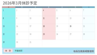 2026年3月の休診予定は、定休の日曜日の午後および水曜日です。よろしくお願い致します。